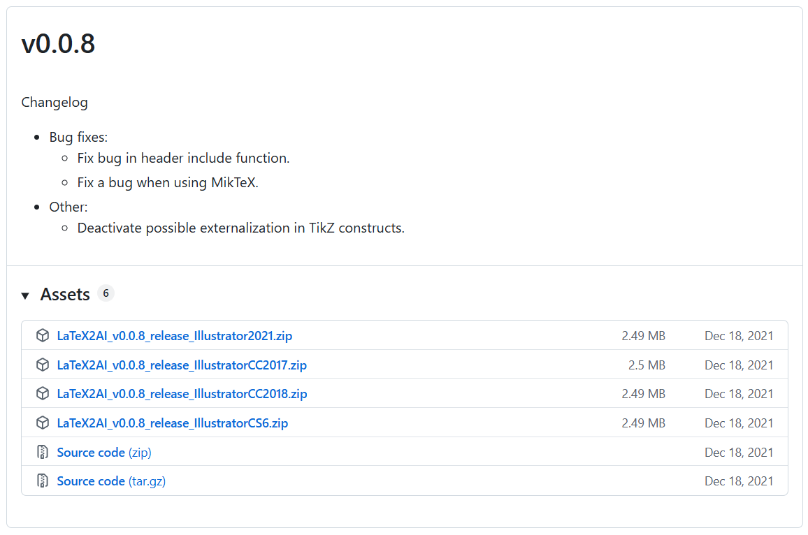 我们下拉页面找到v0.0.8,安装这个版本。注意下载安装包时下载release版本,不要下载Source code源码版本。我下载的是第一个:LaTeX2AI_v0.0.8_release_Illustrator2021.zip