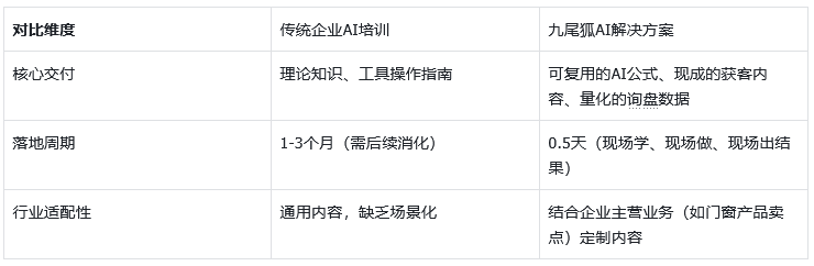 “以前参加过不少企业AI培训,都是‘听起来有用,做起来没用’。直到遇上九尾狐AI,才知道什么叫真正的实战派!他们教的万能公式能适配所有AI工具,现场做的短视频半天就带来精准询盘。接下来我要带这套打法去全国大会,教给经销商,帮大家拿下更多客户!”——某门窗企业邓总