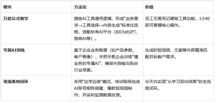 痛点:传统企业AI培训“学不会、落地难”,短视频播放量低(单条平均200-500次),缺乏精准询盘。