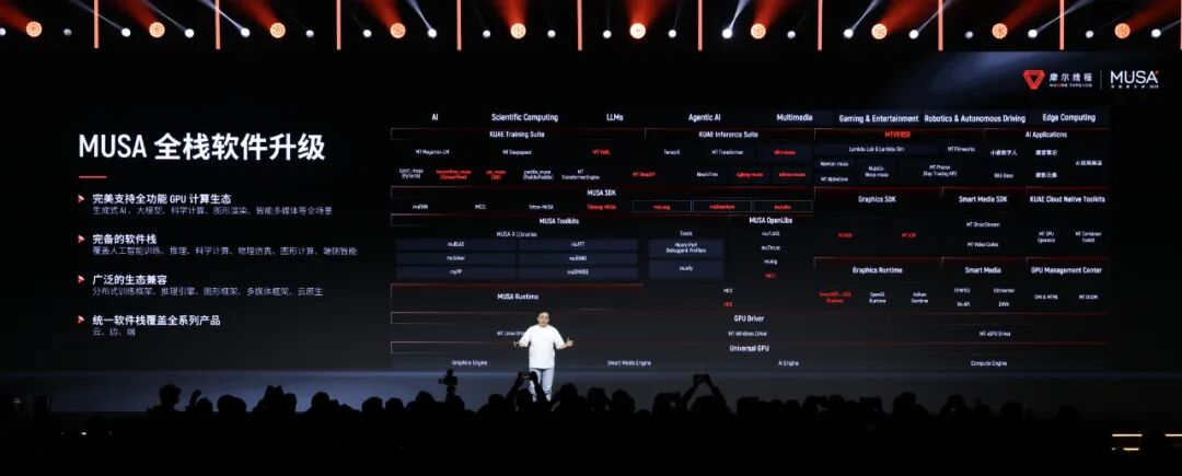 这是摩尔线程的首届 MUSA 开发者大会,也是其上市后技术体系的首次集中亮相。在长达两个半小时的 Keynote 中,摩尔线程创始人、董事长兼 CEO 张建中系统总结了过去五年的技术沉淀与研究成果,密集发布了一系列新产品,并对未来的发展路径进行了展望。