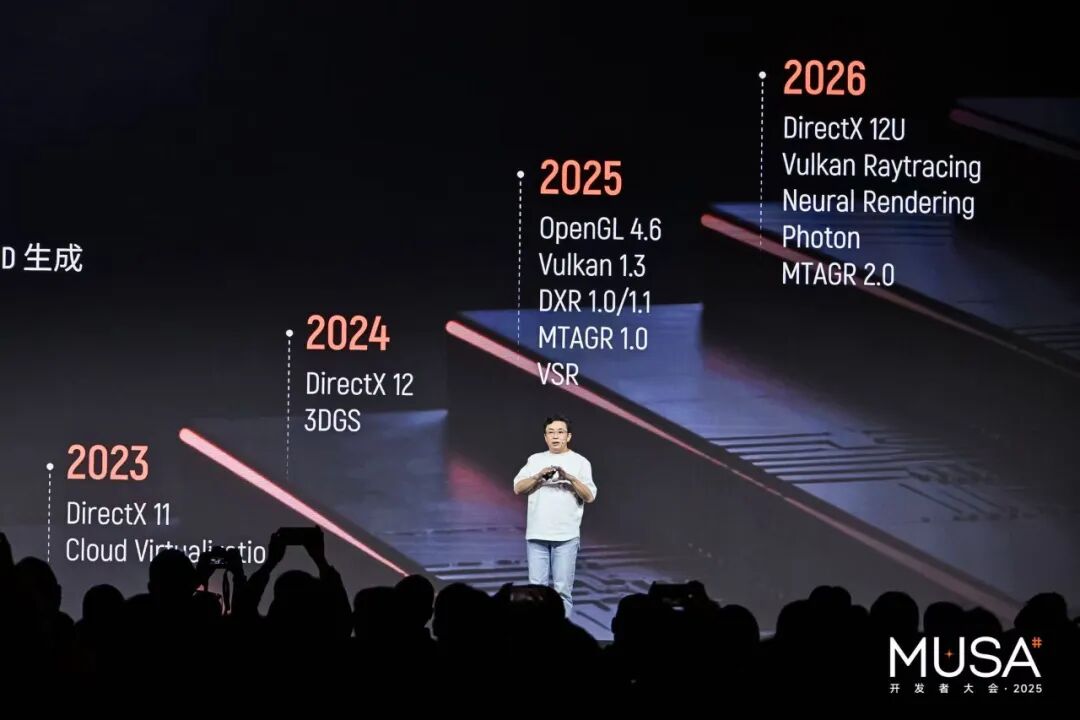 图形处理方面,新架构集成了 AI 生成式渲染架构(AGR),增强的硬件光线追踪加速引擎(光线追踪性能比上一代提升 50 倍),并完整支持了 DirectX 12 Ultimate,这是国产 GPU 首次实现对行业顶级图形标准的完整支持。