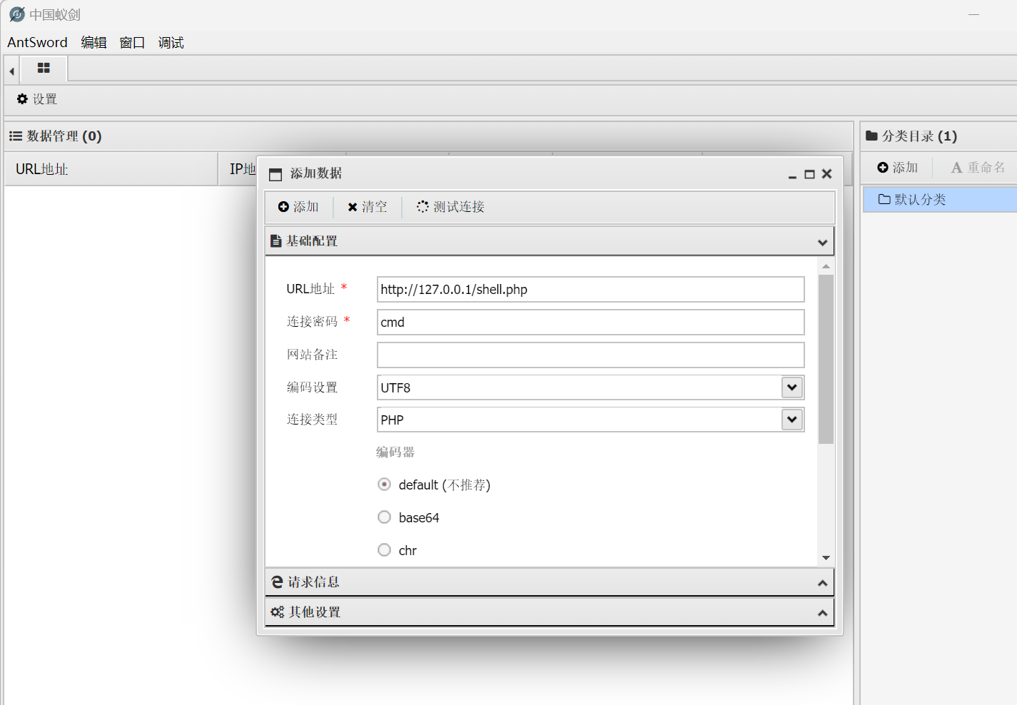 3.然后打开蚁剑,右键空白处,添加数据,url地址填http://ip地址(一般为127.0.0.1)/shell.php,连接密码cmd即可