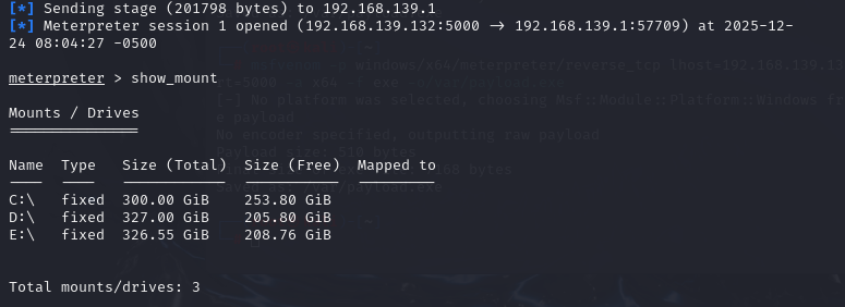 成功建立起Meterpreter 会话,输入show_mount