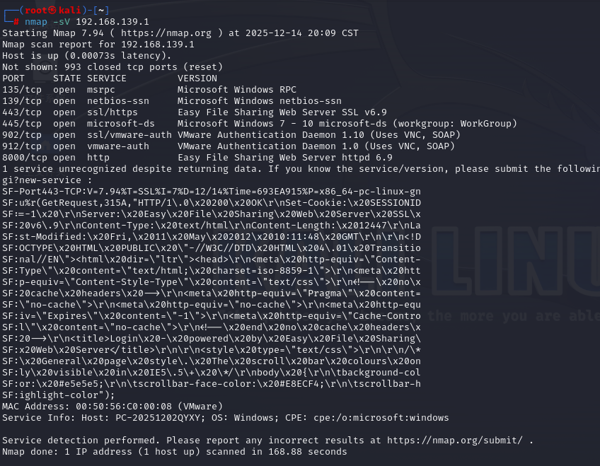 然后打开kali,用nmap -sV <ip地址>扫描主机端口及服务名称、版本号,这里发现有8000端口是开启的,而且为Easy File Sharing Web Server服务