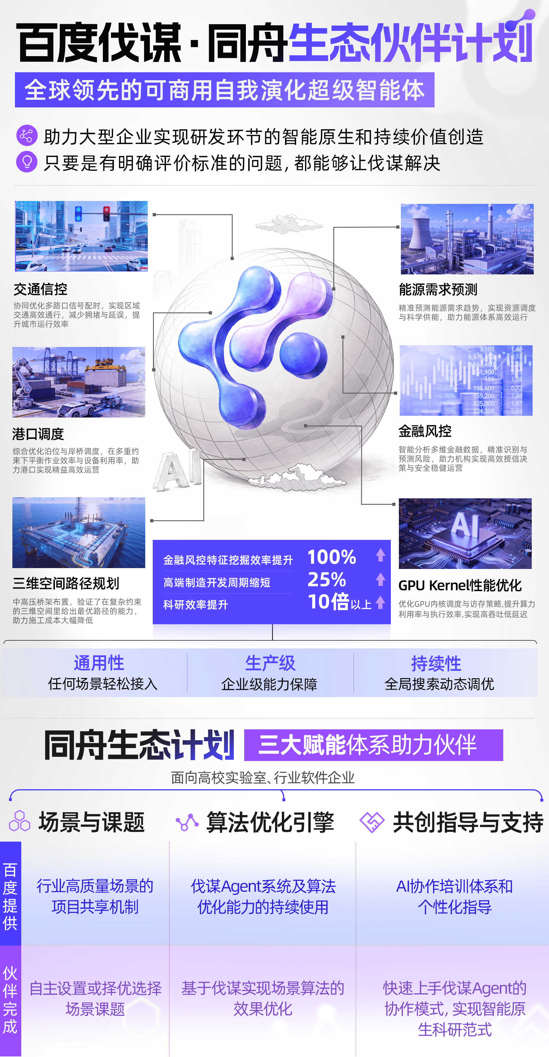 为了进一步加速AI在千行百业的渗透,让顶尖算法工程师将成为企业和科研标配,百度伐谋正式发布“同舟生态伙伴计划”,面向高校实验室、行业软件企业,开放高质量行业场景与课题,共享伐谋Agent系统及算法优化引擎,并提供AI协作培训与个性化服务指导。对于高质量伙伴的科研创新或产业实践项目,百度伐谋将提供全面免费支持。