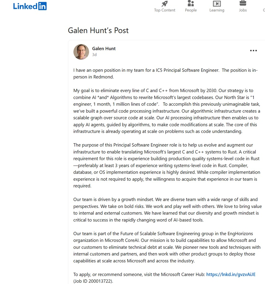 这个核心高级专家职位不是闹着玩的,他表示:「我的目标是在 2030 年消灭微软所有的 C 和 C++ 代码。策略是使用 AI 与算法的方式,重写微软整个代码库。」