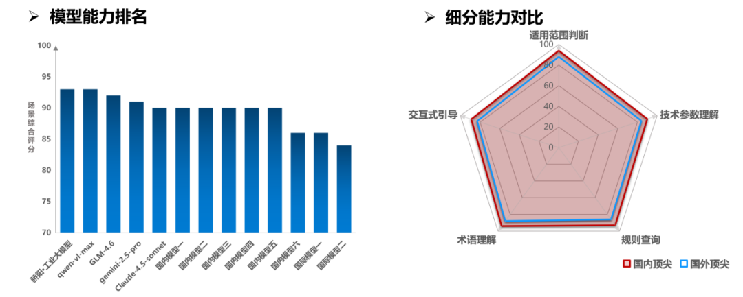▶在发展趋势上,国内外顶尖模型的基础能力已较为接近,细分领域各有优势;国内外大模型在智能体任务上表现接近,国内模型复杂环境理解力有待提升。国内大模型在标准问答、单据识别等多个工业应用场景中领先。