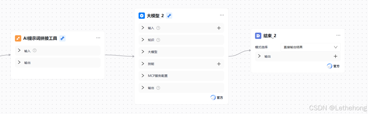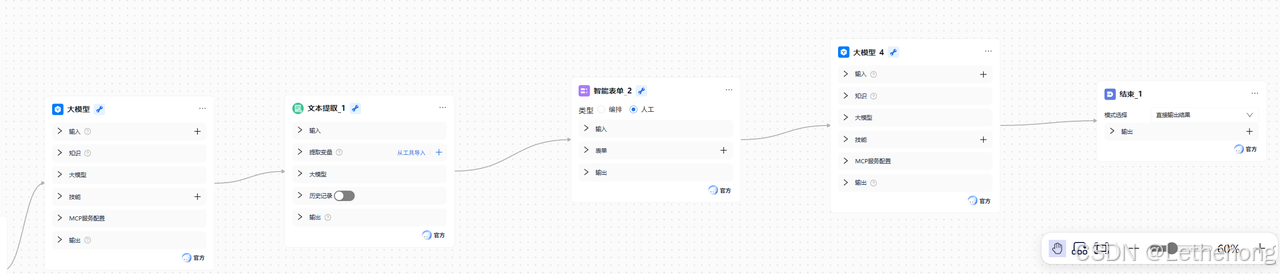 图中的这五个节点,第一个是大模型,不用多说;第二个是文本提取,也就是将你上传的简历文档进行文字提取;第三个智能表单,也就是代替面试评价表单的(这里未改名);第四个也是大模型,这个大模型就是将第二个节点和第三个节点的内容做一次整理分析总结;最后一个就是结束,用来输出。