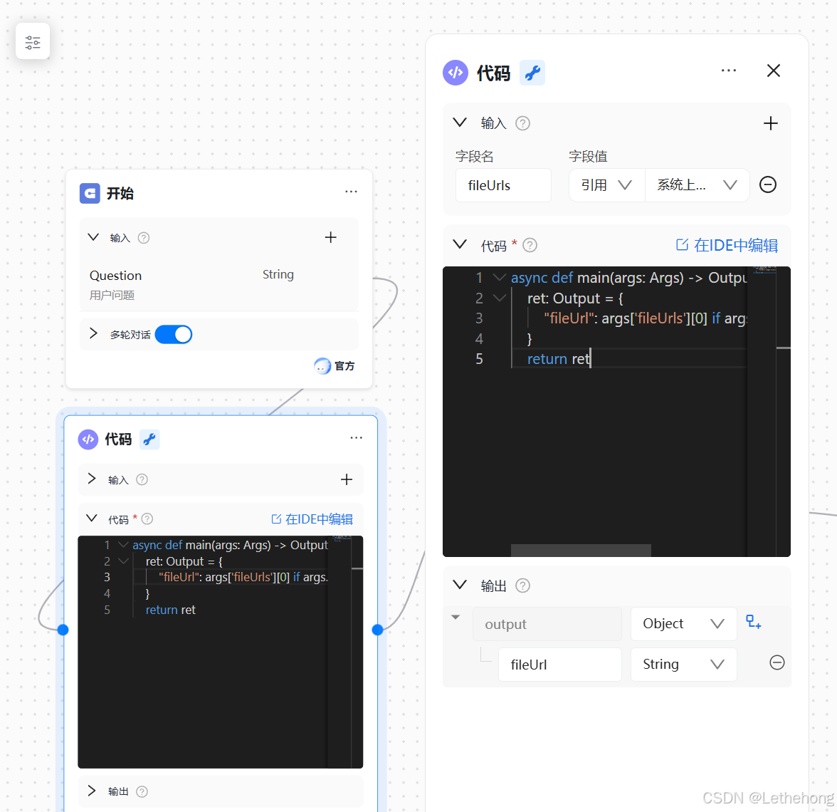 这里的if条件节点是说:如果用户直接提问则选择“AI提示词拼接工具”节点,若用户输入了提示词,并附上自己的简历文件,则前往下一个“if节点”做选择,若都不是,则直接结束。