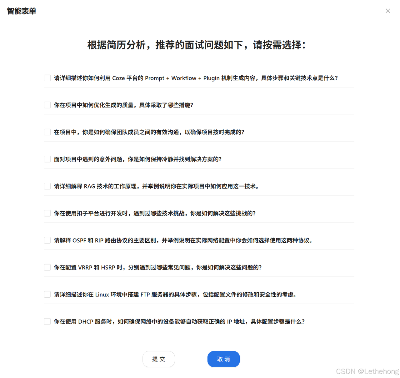 #### 总结 面试者在项目管理和网络技术方面表现出了较强的专业知识和实际操作能力,能够有效地协调团队成员,处理项目中的意外问题,并且对路由协议、VRRP/HSRP、FTP 服务器搭建和 DHCP 服务配置有较为深入的理解。面试者具备良好的沟通能力和解决问题的能力,适合 AI 方向的实习生岗位。