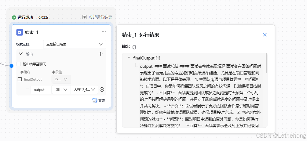 这里一样给大家展示运行一下,在运行的时候,会出现一个面试问题(这就是第三个智能表单节点提供的):