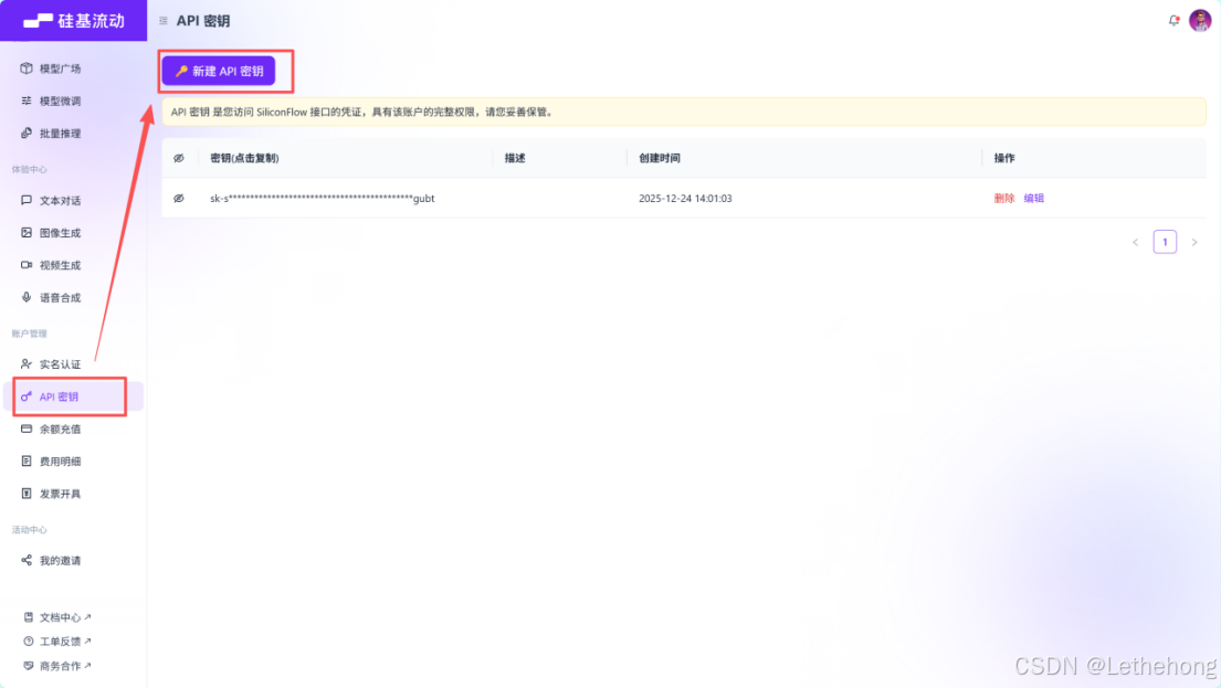 这里需要api,我们复制里面的地址前往硅基流动平台获取即可。登录进来按照图中步骤即可获得API,然后复制进去即可。