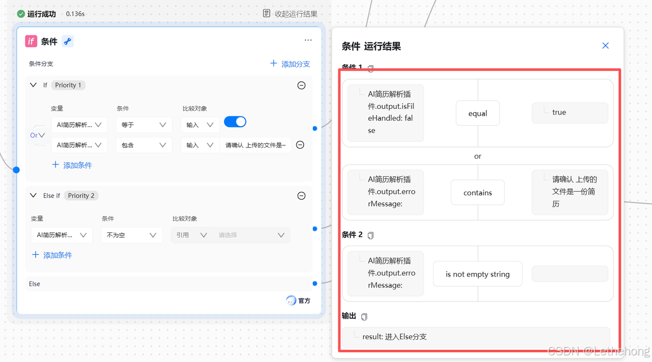这里我在运行的时候点击“运行结果”可以清晰的看到“if条件”节点是如何做选择的。
