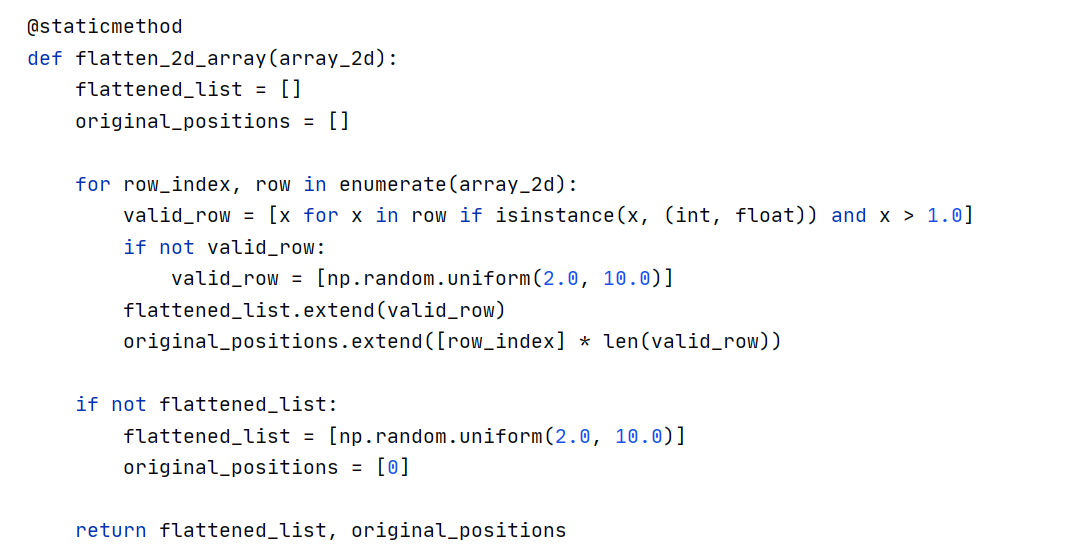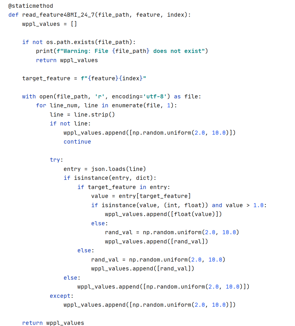 逐行读取解析json格式的文件内容,存在目标特征,且值是大于1.0的值,则保留;若无有效特征就使用2.0-10.0随机填充。输出一个2D列表(每行对应一条样本的特征)