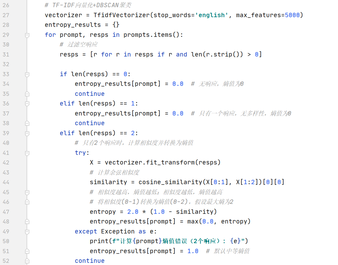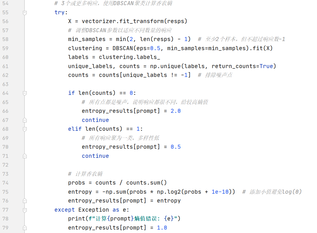 (1)语义熵:衡量模型对于同一提示词生成响应的语义一致性/多样性的指标,通过TF-IDF向量化和DBSCAN聚类计算,熵值越低表示响应越一致,越可能来自训练数据(即越可能是真实数据)