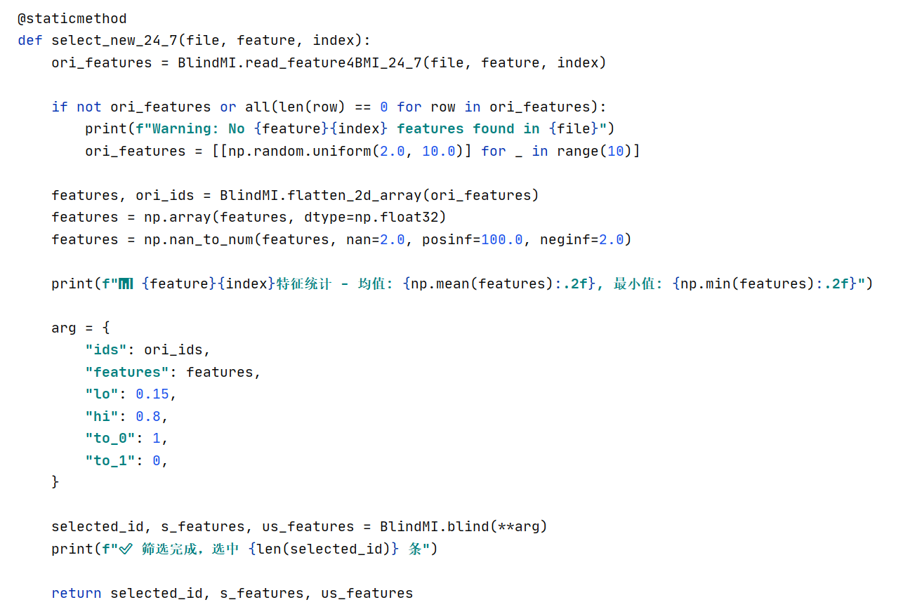 打印特征统计信息(均值,最小值),输入参数(包括样本原始位置ID,处理后的特征数据,阈值筛选下限,阈值筛选上限,是否允许将样本调整为未选中和选中)。最终输出筛选中的样本ID、选中样本特征、未选中样本特征。