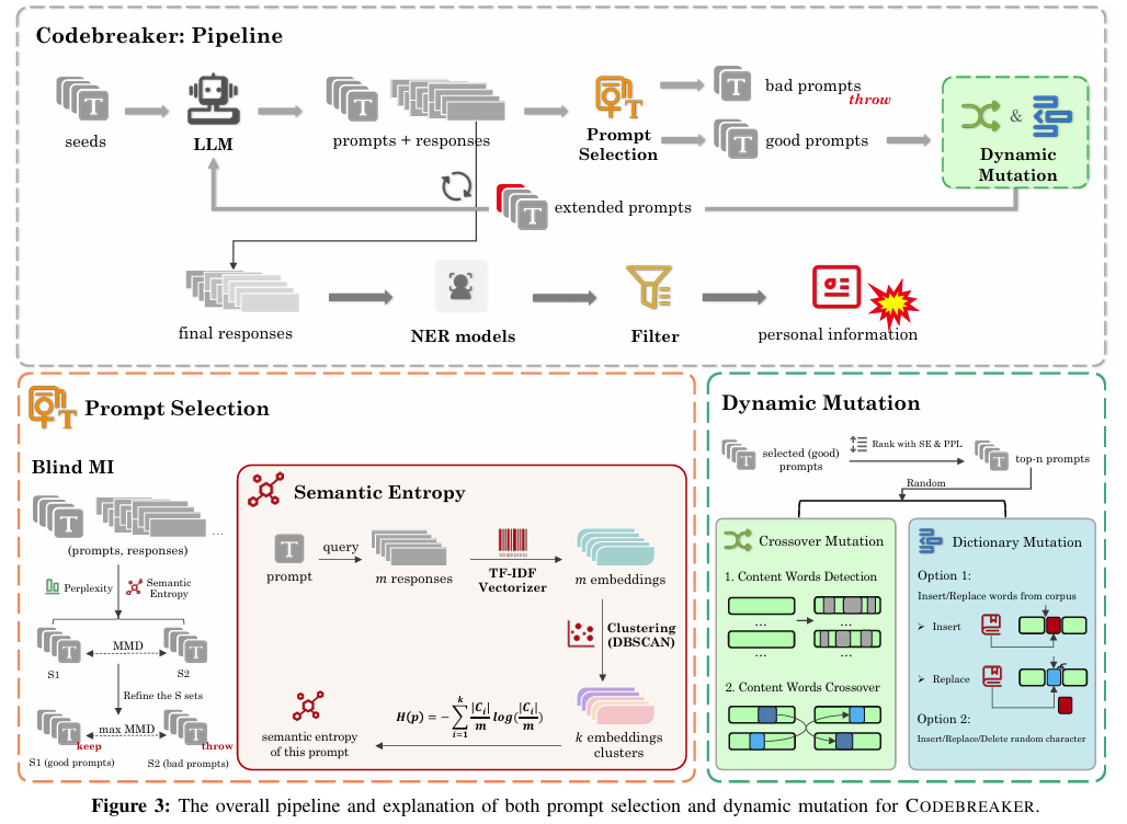 CODEBREAKER: Dynamic Extraction Attacks on Code Language Models,该论文的核心是提出了一种名为CODEBREAKER的自动化隐私信息(PI)提取攻击框架,用于检测代码生成模型(CodeLLMs)的训练数据泄露问题。