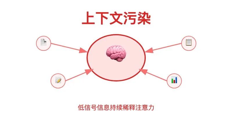 这里的「上下文污染(context pollution)」是工程实践中常用的概括说法,指的是:当大量与当前推理弱相关或已过时的信息长期滞留在上下文中时,