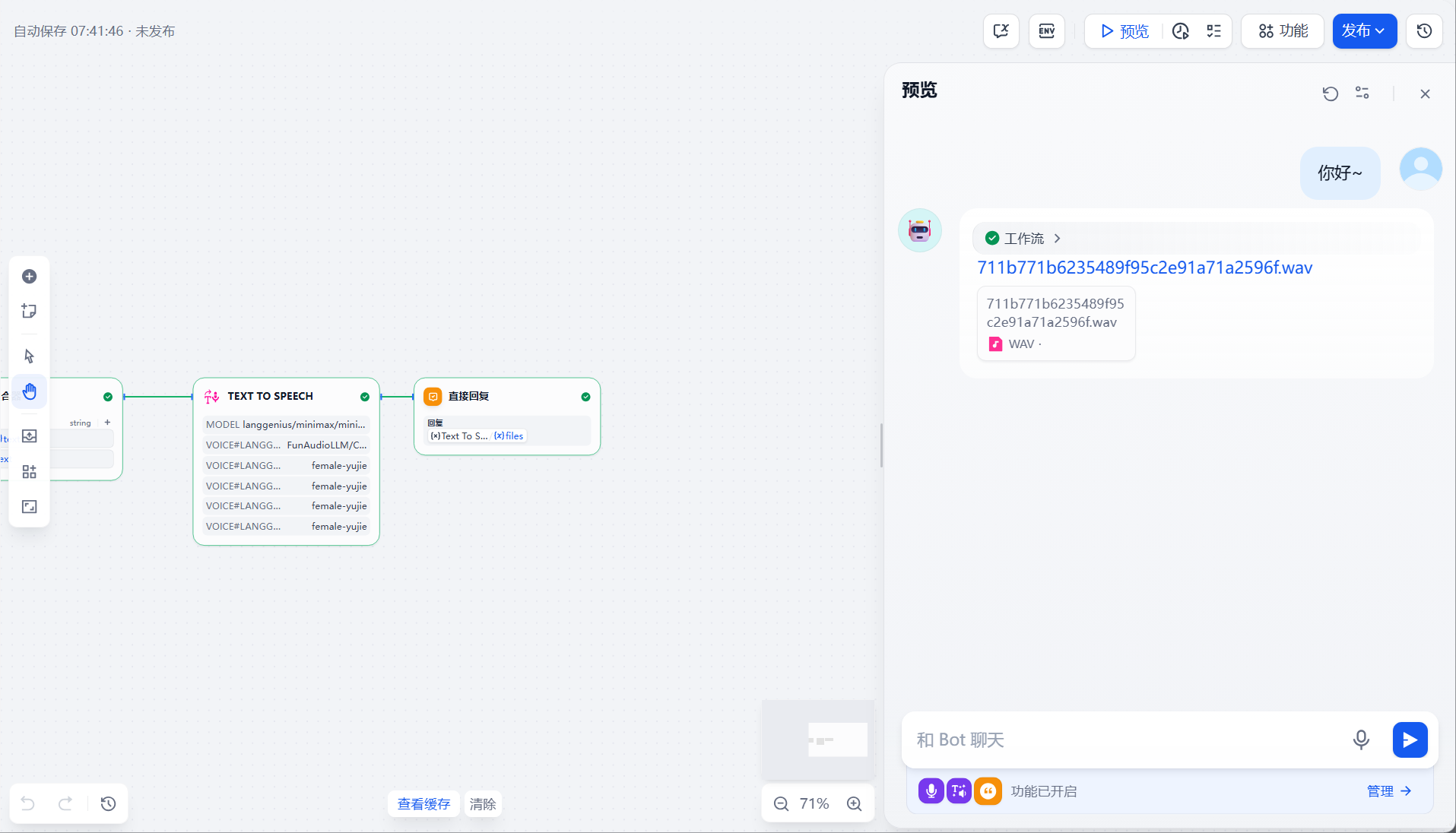 而之前无文字输出的原因也很清晰了:直接回答需要同时接收文本内容和语音文件,文本内容正是来自变量聚合器整合后的output;如果不插入它,TEXT TO SPEECH没有可转换的文本源,直接回答也缺少文字输入,自然只会生成音频、没有文字 —— 变量聚合器其实是给后续的语音转换、最终回复提供了内容来源。