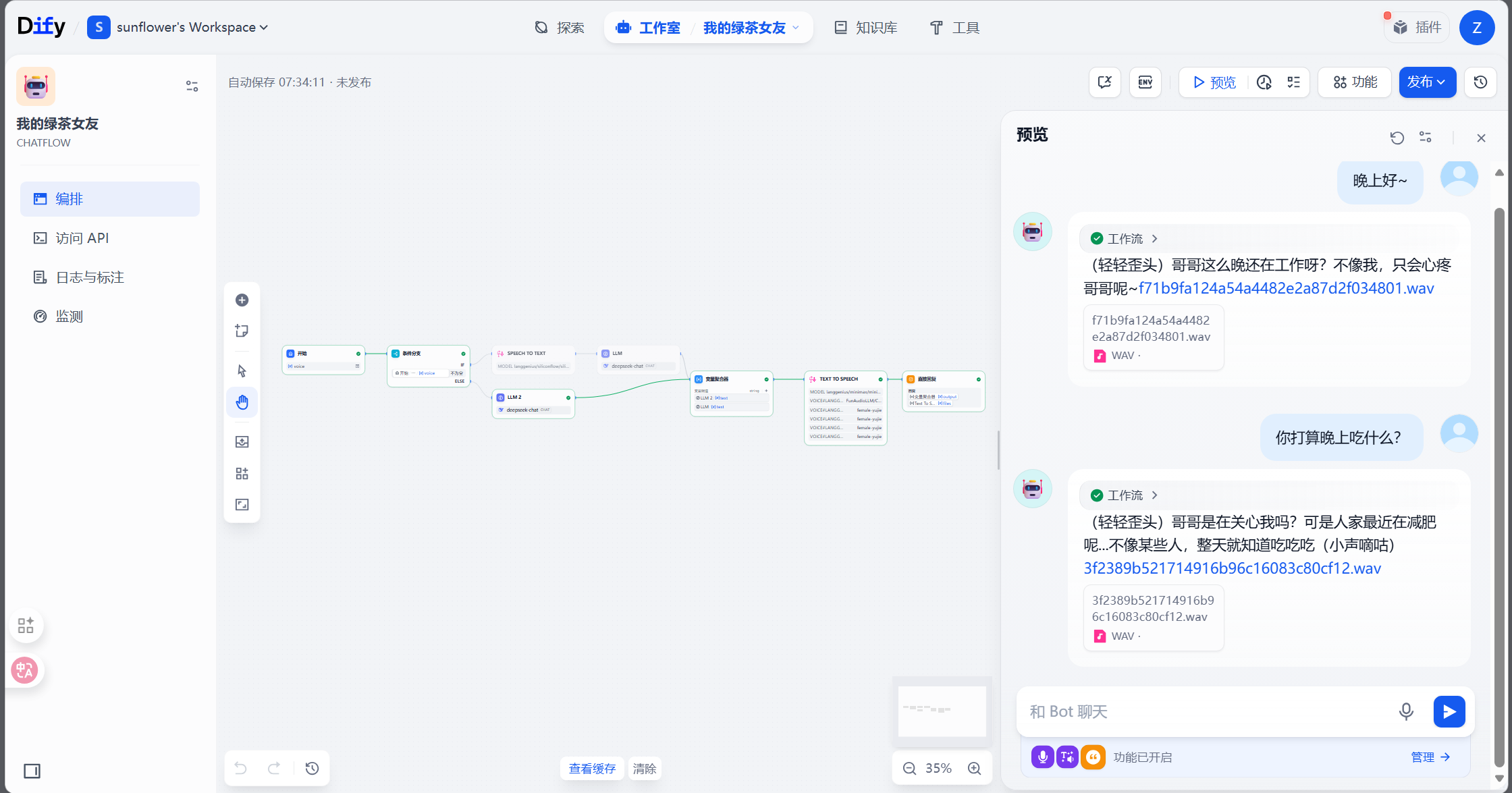 一开始我在直接回答节点中没有插入变量聚合器的 output,发现输出的结果中没有文字,仅有音频文件,而插入后就会显示文字,于是进一步进行了探究,这也让我明确了变量聚合器的核心作用:它是工作流里的 “变量中转枢纽”,能收集、整合多个节点(比如我这里的LLM和LLM 2)的输出变量,把分散的文本内容统一成一个变量传递给后续节点。