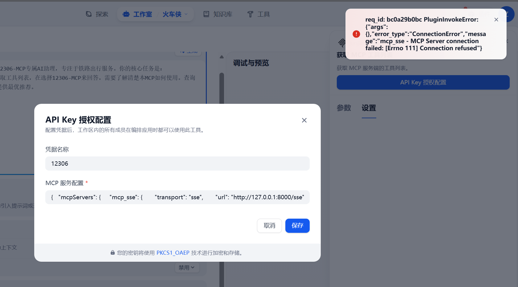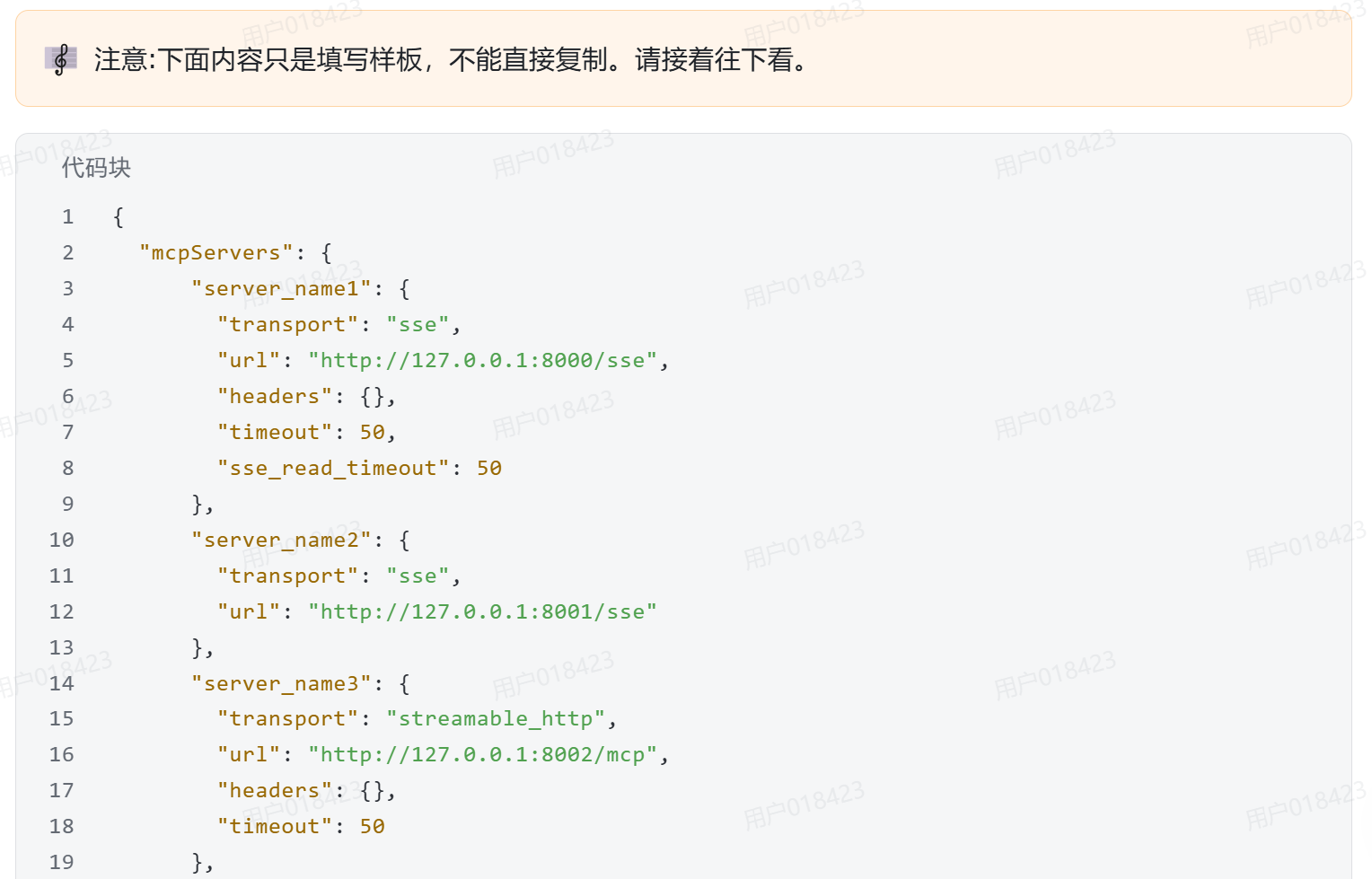 重新研究了教程中2.4 (MCP SSE / StreamableHTTP用法介绍)填写样例的代码组成,根据自己的配置,按照样例改写了这个代码块