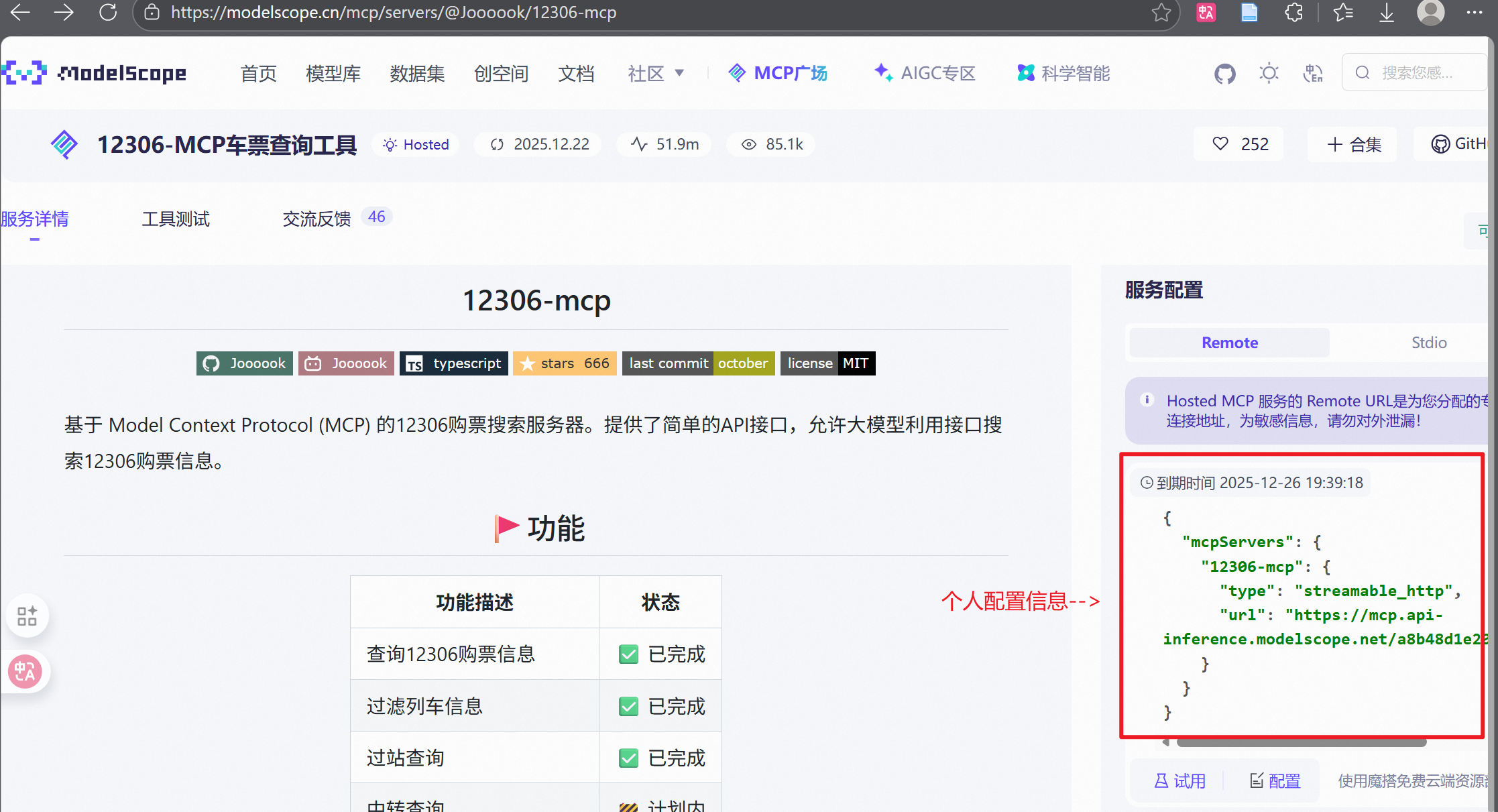 - 作用:是 Agent 实际执行 12306 相关服务的核心工具,能调用 12306-MCP 提供的接口(比如查询湖州到杭州的高铁车次、规划行程等),获取真实的铁路出行数据。