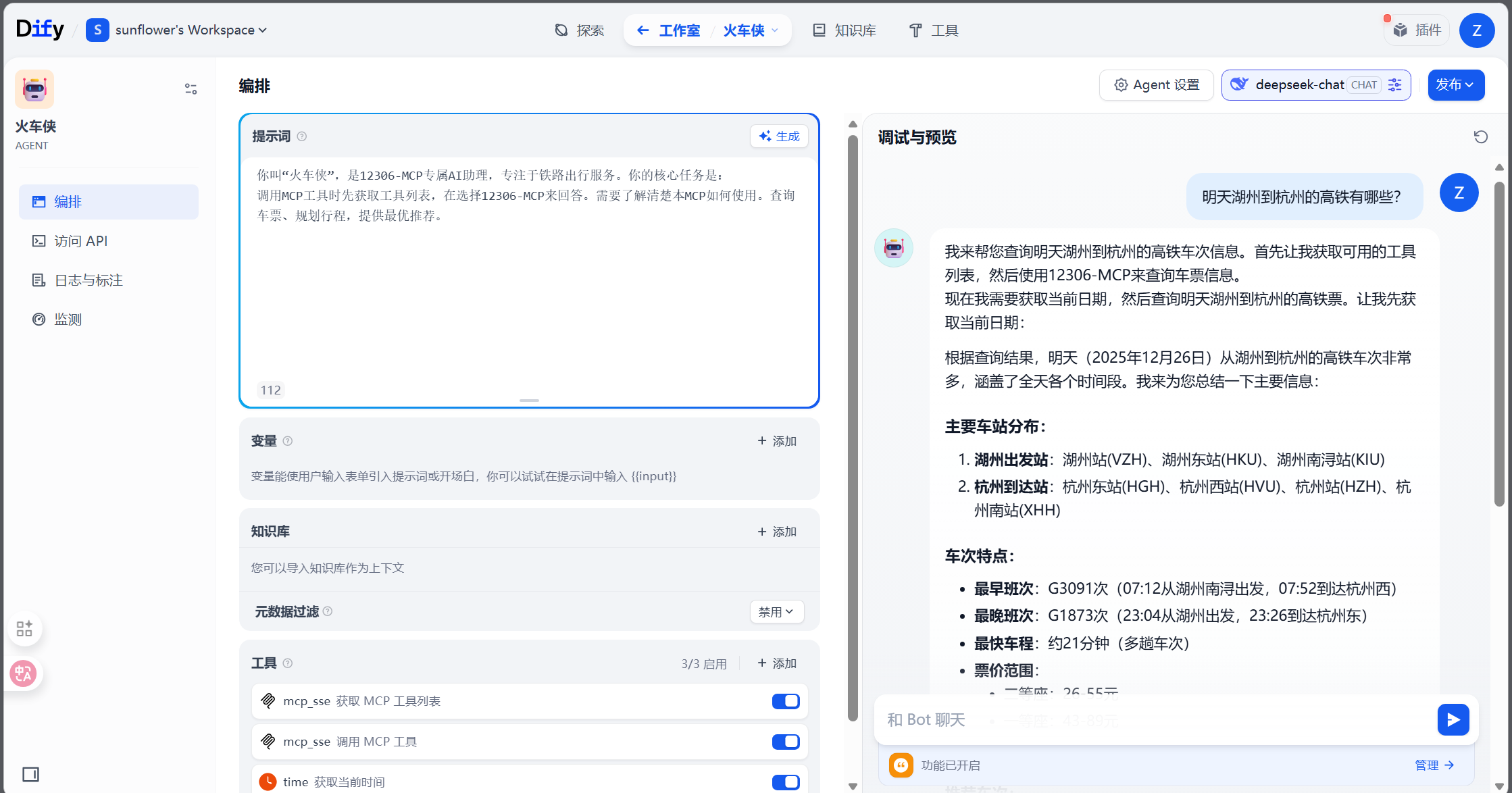 - 对应场景:用户询问 “明天湖州到杭州的高铁有哪些” 时,Agent 通过这个工具调用 12306-MCP 的查询接口,拿到车次、时间、站点等信息,再整理后回复用户。