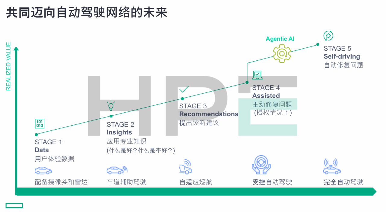 随着智能体AI(Agentic AI)的快速兴起,网络正从传统自动化运维迈向智能时代。HPE Networking提出“自动驾驶的网络”演进路线,以类似于自动驾驶汽车从L1到L5的五级等级划分,描绘未来网络智能化的最终形态:第一阶段聚焦数据采集与 AI 数据湖,第二阶段形成专业洞察,第三阶段实现跨域关联与自动诊断,第四阶段在授权下主动修复,第五阶段迈向全栈智能,提前发现问题并自动完成修复。