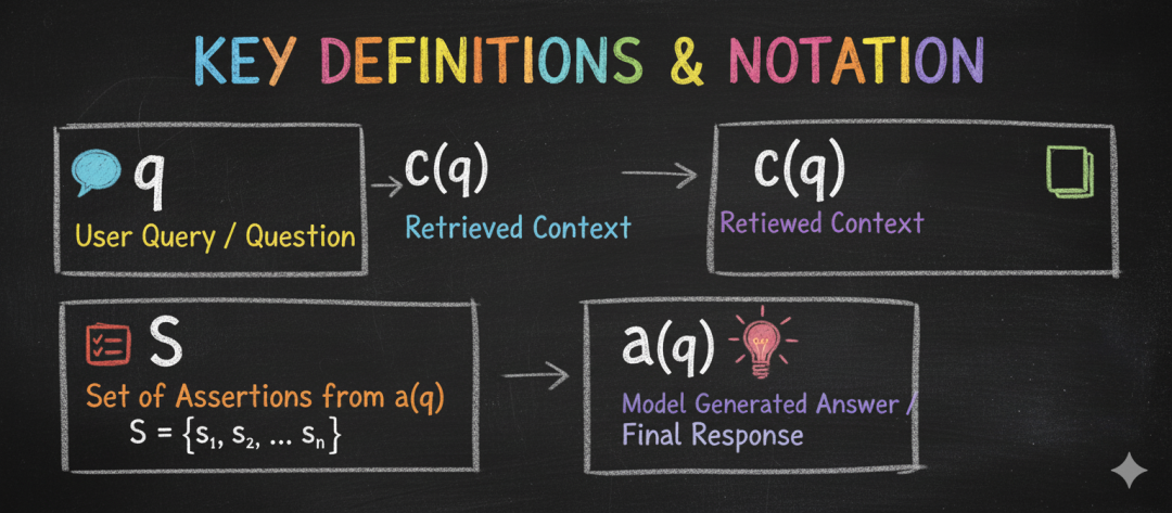 *S*={*s*_1,s_2,...,*s_n*} - 核对:逐个检查 S里的每个断言s_n.是否能从检索到的上下文 c(q)中找到证据(原文)支持。