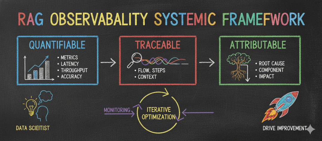 即,建立一套系统性的 RAG 可观测性体系。通过可量化、可追踪、可归因的指标,持续监控系统运行状态,并驱动迭代优化。