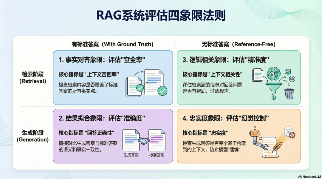 RAG系统评估四象限矩阵与六大核心指标解析 摘要:本文提出RAG系统评估的四象限矩阵框架,详细解析忠实度、回答相关性、上下文相关性等六大核心评估指标。重点阐述了"检索决定上限,生成决定下限"的评估理念,特别强调忠实度作为企业级应用质量保障的关键指标。通过断言验证、代理问题生成等方法,建立不依赖人工标注的自洽性评估体系,为RAG系统从Demo走向生产环境提供科学的量化评估方案,助