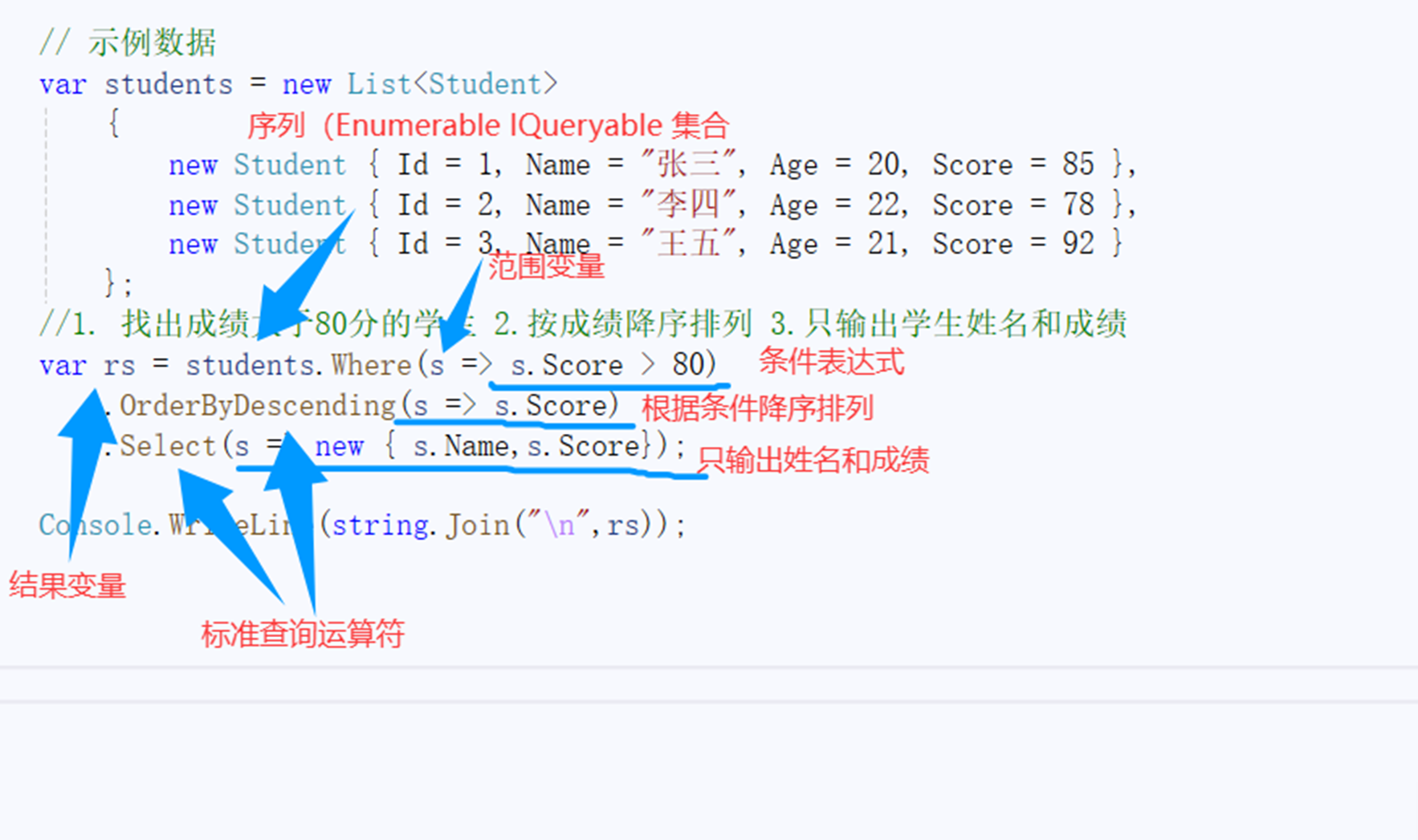 我们可以为实现`IEnumerable <T>`或` IQueryable <T>`接口的类编写LINQ查询。。