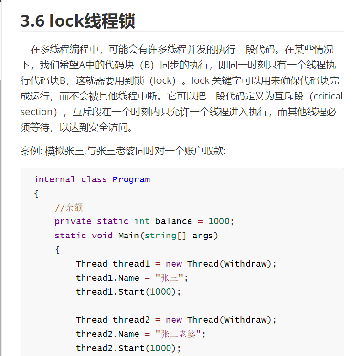 private readonly object _lock = new object(); lock(_lock) { /* 临界区 */ } -