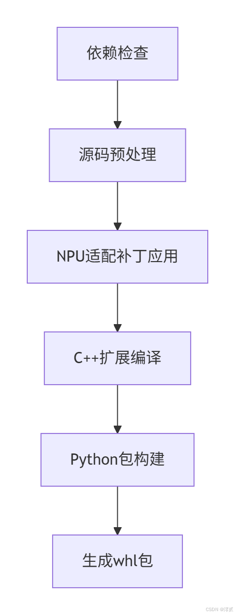 Plain Textgraph TB A[依赖检查] --> B[源码预处理] B --> C[NPU适配补丁应用] C --> D[C++扩展编译] D --> E[Python包构建] E --> F[生成whl包] |