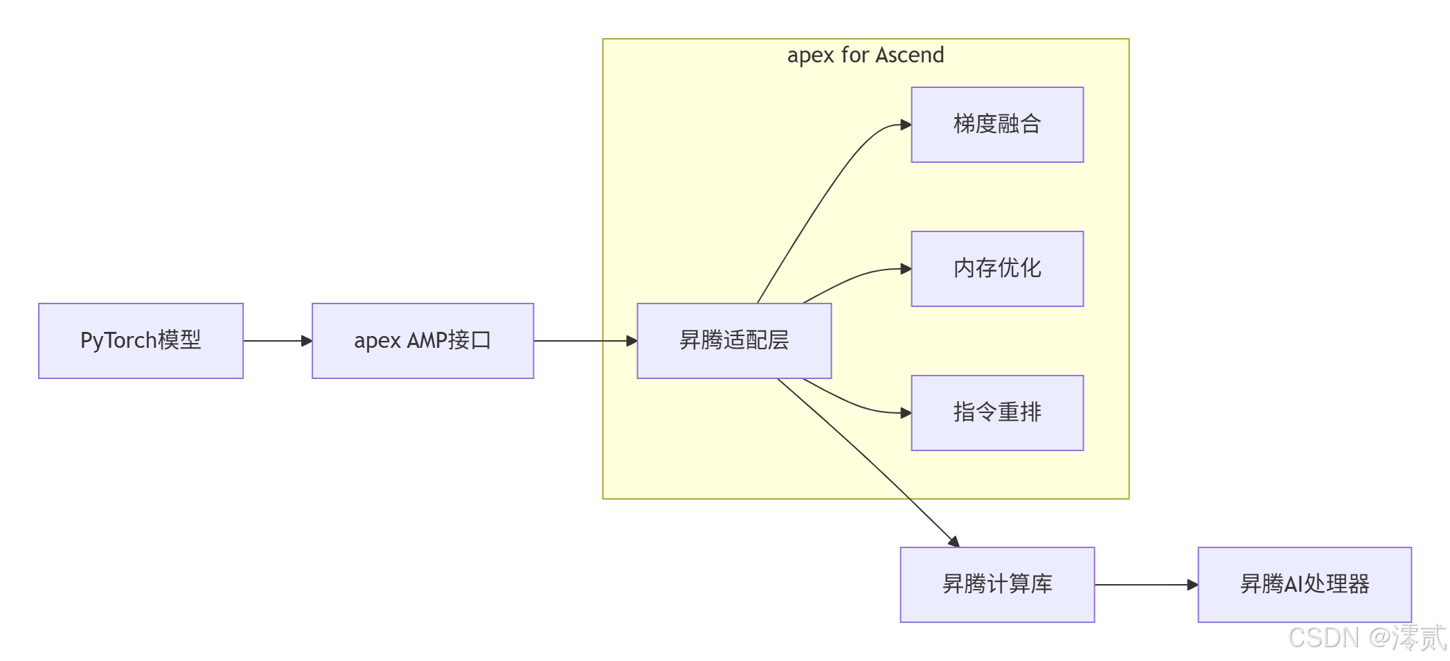 NVIDIA Apex(A PyTorch Extension)是开源的混合精度训练工具库。而apex for Ascend通过代码级修改,使其兼容华为昇腾AI处理器架构,主要提供三大核心能力: