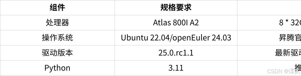 Bash# 检查NPU设备状态npu-smi info# 输出示例+--------------------------------------------------------------------+| npu-smi 1.7.7 Version: 25.0.rc1.1 |+-------------------------------+-------------------+----------------+| NPU Name Health Power Temp Memory-Usage || Chip Bus-Id AICore-Usage |+===============================+===================+================+| 0 Atlas 800T A2 OK 75W 45°C 0/32768 MB || 0 0000:7B:00.0 0% |+-------------------------------+-------------------+----------------+ |