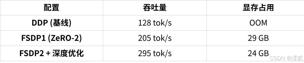 - ZeRO-3:完全分片参数,显存降至1.9GB