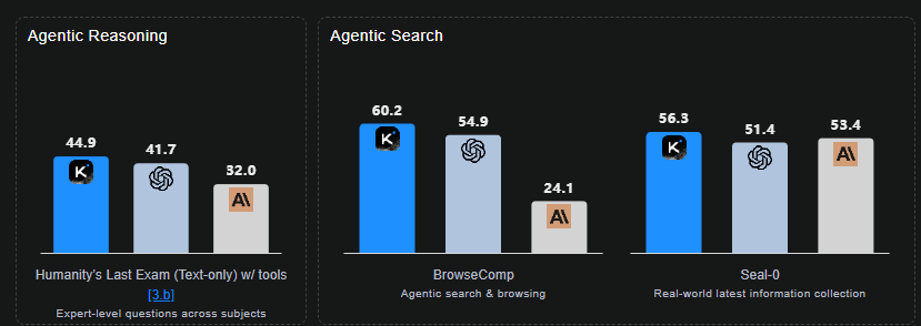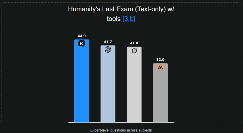 - 推理(长程 + 多工具):HLE w/ tools = 44.9%(state-of-the-art in release);能够在数十次工具调用内解决高难度学术问题(23 次交错推理+工具调用解博士级题)。