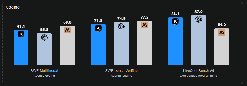 - 编码/工程能力:SWE-Bench Verified = 71.3%;LiveCodeBench、OJ-Bench 等显示在多语言编程、算法题、终端交互场景有实际落地能力。