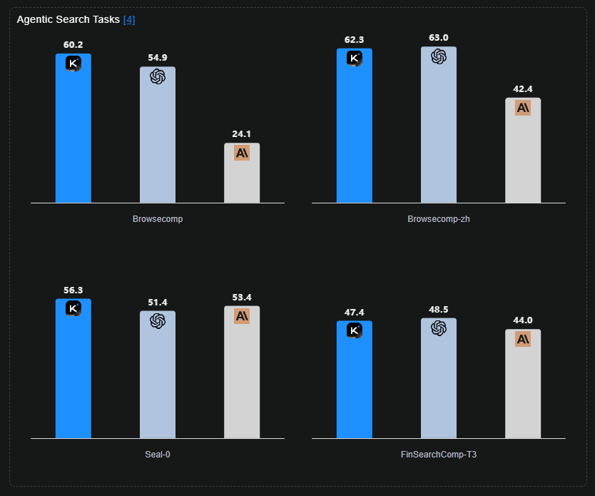 - Agentic 搜索/浏览:BrowseComp = 60.2%(远超人类 baseline 29.2%),说明 K2 在动态网页检索、证据聚合、长期信息追踪上有显著优势。