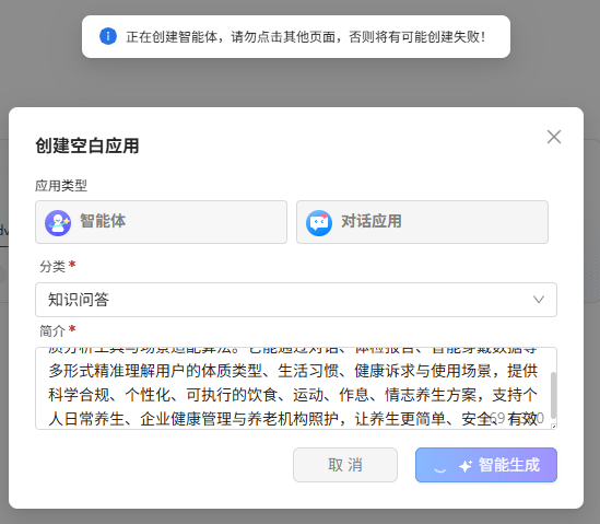 点击 “智能生成” 优化提示词,确定应用类型为 “智能体”,分类选择 “健康服务”。