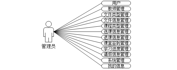 (1)管理员关键功能包含用户、教师管理、文件类型管理、文件信息管理、课程类型管理、选课信息管理、退课信息管理、课堂签到管理、学习进度管理、请假信息管理、系统管理、我的信息等进行管理。管理员用例如下: