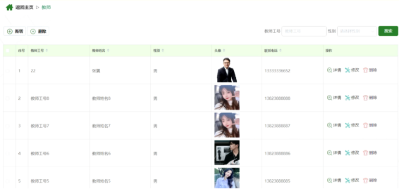 教师管理功能在视图层(view层)进行交互,比如点击“搜索、新增或删除教师表单。这些教师表单动作被视图层捕获并作为请求发送给相应的控制器层(controller层)。控制器接收到这些请求后,调用服务层(service层)以执行相关的业务逻辑,例如验证输入数据的有效性和与数据库的交互。服务层处理完这些逻辑后,进一步与数据访问对象层(DAO层)交互,后者负责具体的数据操作如详情、修改或删除教师信息,并将操作结果返回给控制器。最终,控制器根据这些结果更新视图层,以便教师功能可以看到最新的信息或相应的操作反馈。如图5-8所示:
