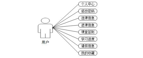 (3)用户关键功能包含个人中心、修改密码、选课信息、退课信息、课堂签到、学习进度、请假信息、我的收藏等进行管理。学员用例如下: