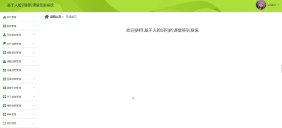 (3)管理员通过后台管理界面,实现对用户、教师管理、文件类型管理、文件信息管理、课程类型管理、选课信息管理、退课信息管理、课堂签到管理、学习进度管理、请假信息管理、系统管理、我的信息等功能的操作;