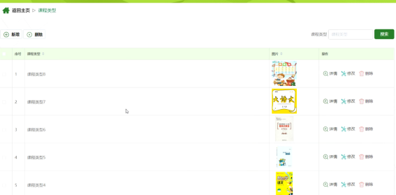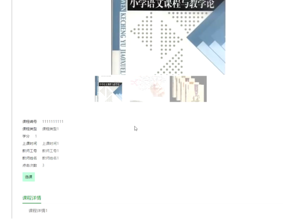 课程信息:编号、名称、类型、封面、学分、上课时间、详情、教师、点击/收藏数
